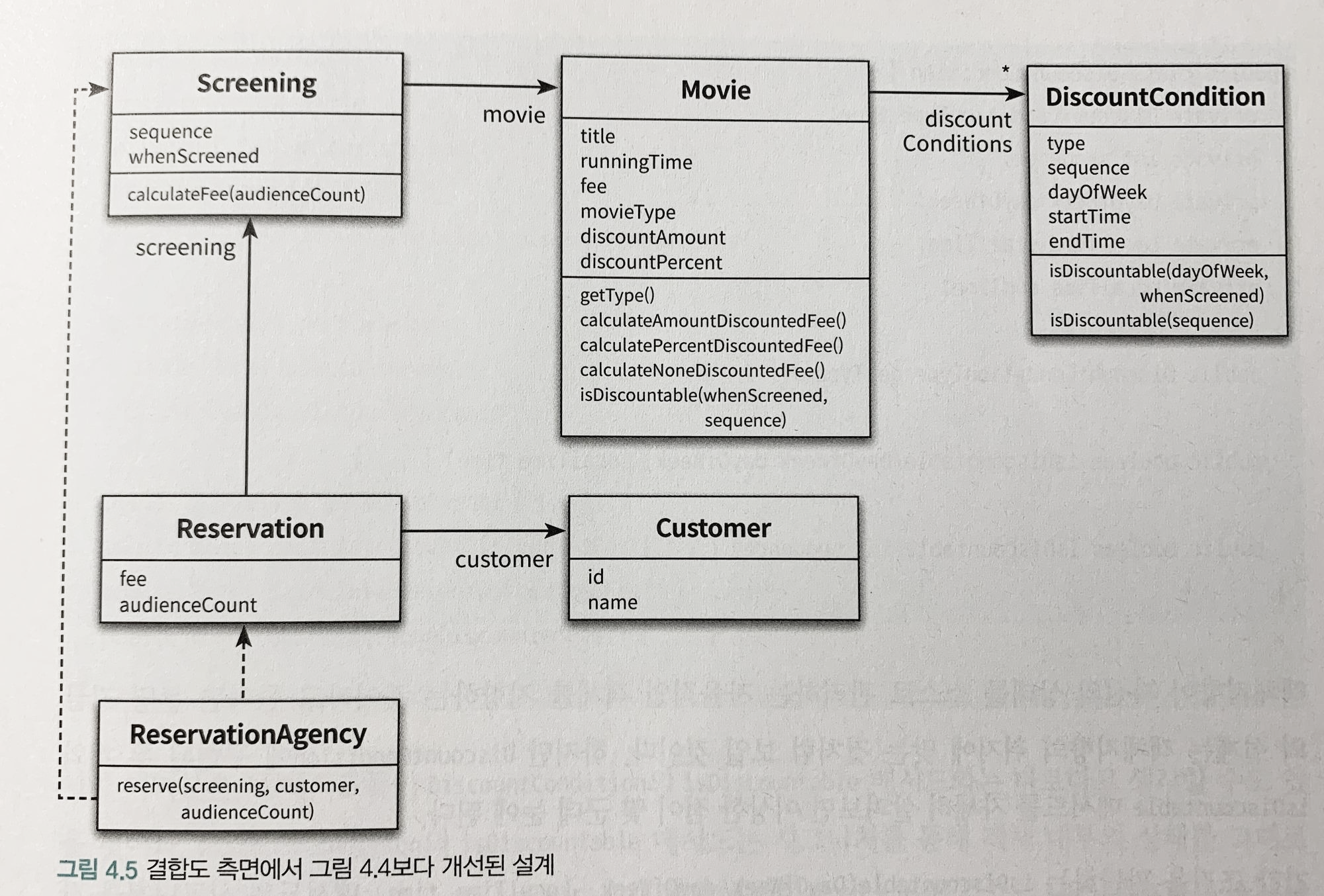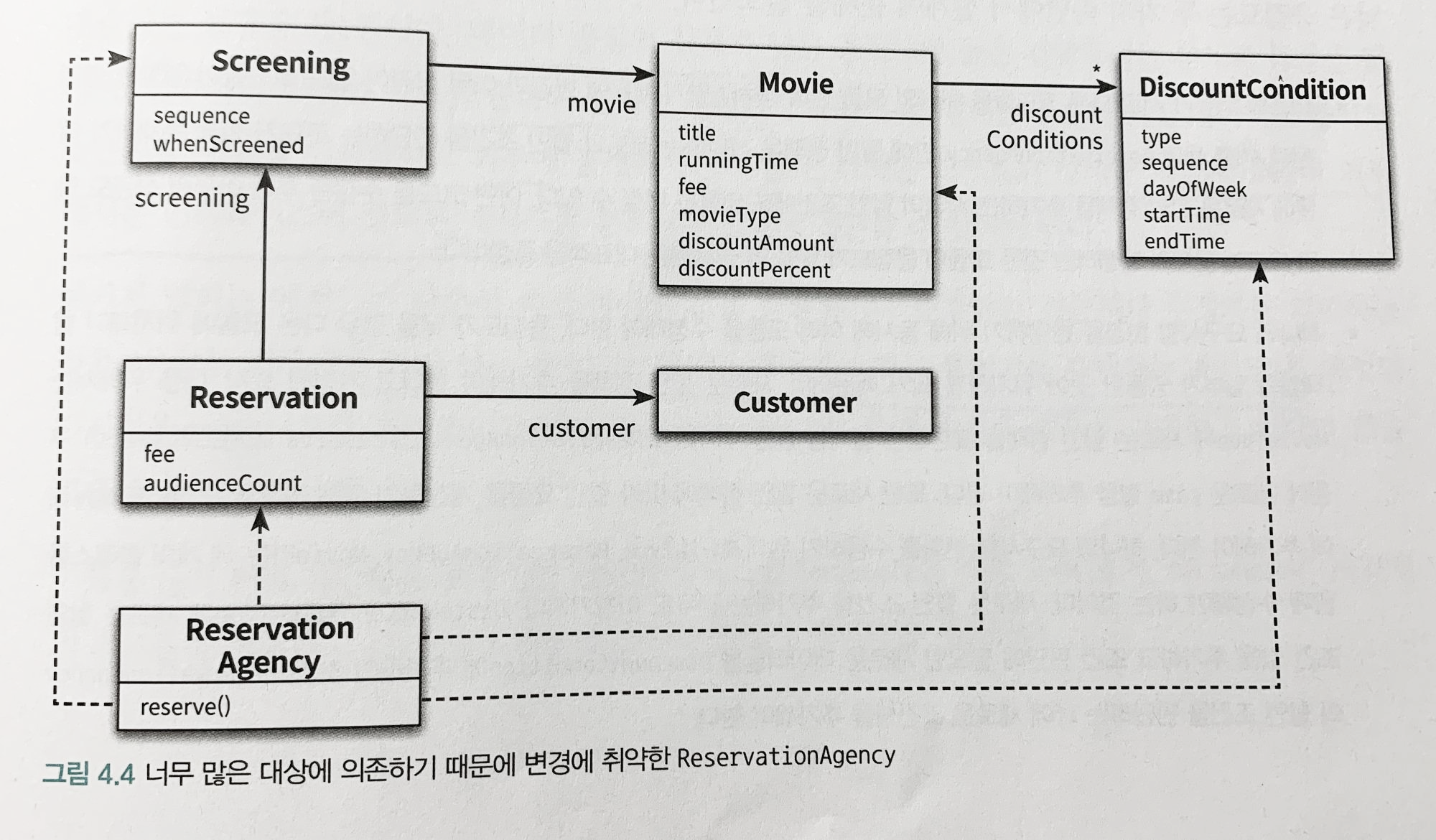 3) DiscountCondition을 만족하는지 판단하는데 필요한 정보가 변경되면, isDiscountable()의 파라미터를 수정해야 하고 메서드 시그니처도 바꿔야 하고 이 메서드에 의존하는 Screening까지 변경해야 한다.